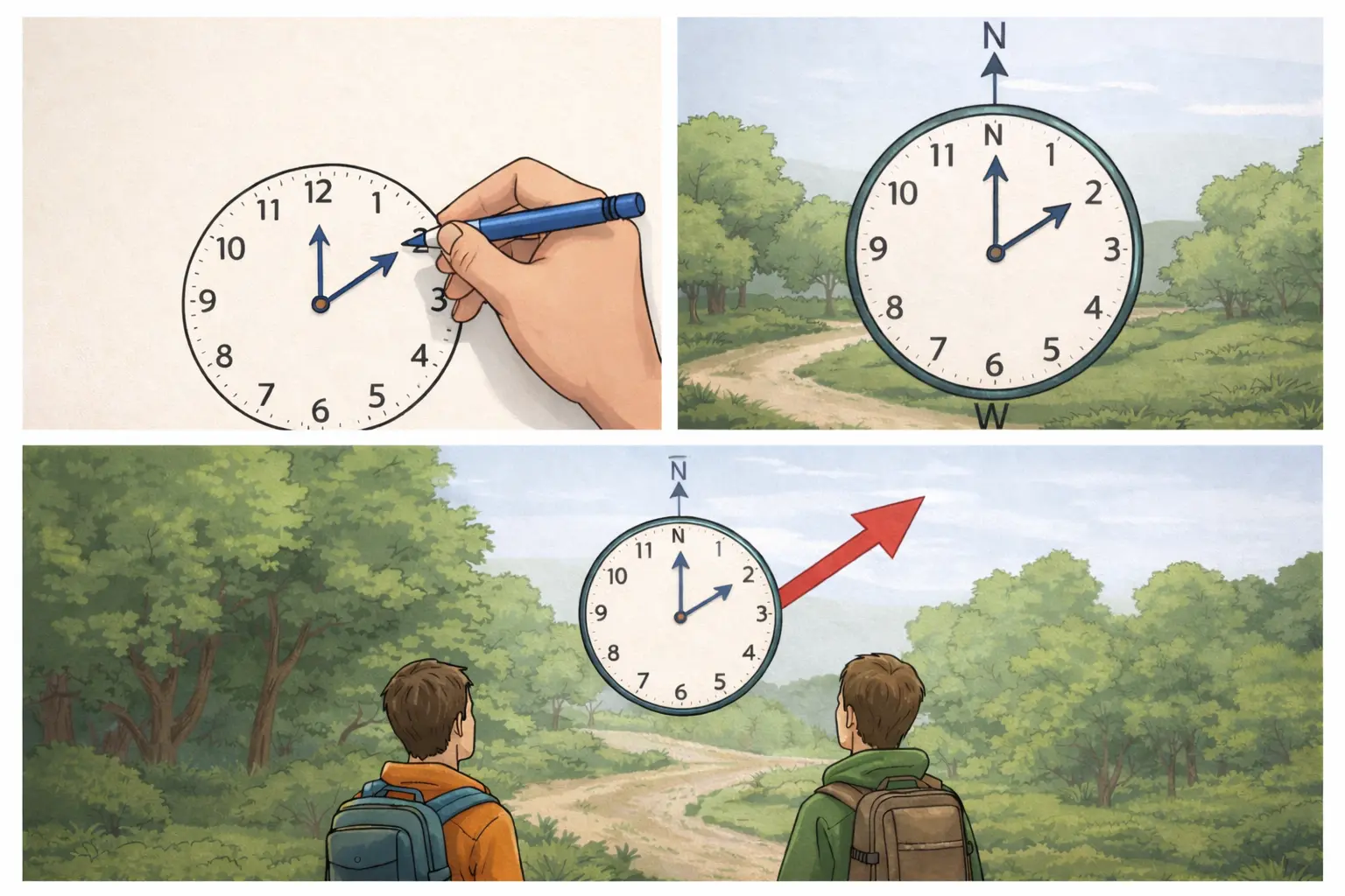 De deelnemers krijgen bij dit onderdeel een analoge klok te zien met een uurwijzer en een minutenwijzer of ze krijgen een tijd aangegeven met minuten en uren. In het geval dat er een tijd gegeven word moeten de deelnemers hier eerst een analoge klok bij tekenen met de overeenkomstige tijd. Vervolgens moet de klok zo georiënteerd worden dat de uurwijzer naar het noorden wijst. De richting die de minuten wijzer op wijst is de richting waarin de route vervolgd dient te worden.