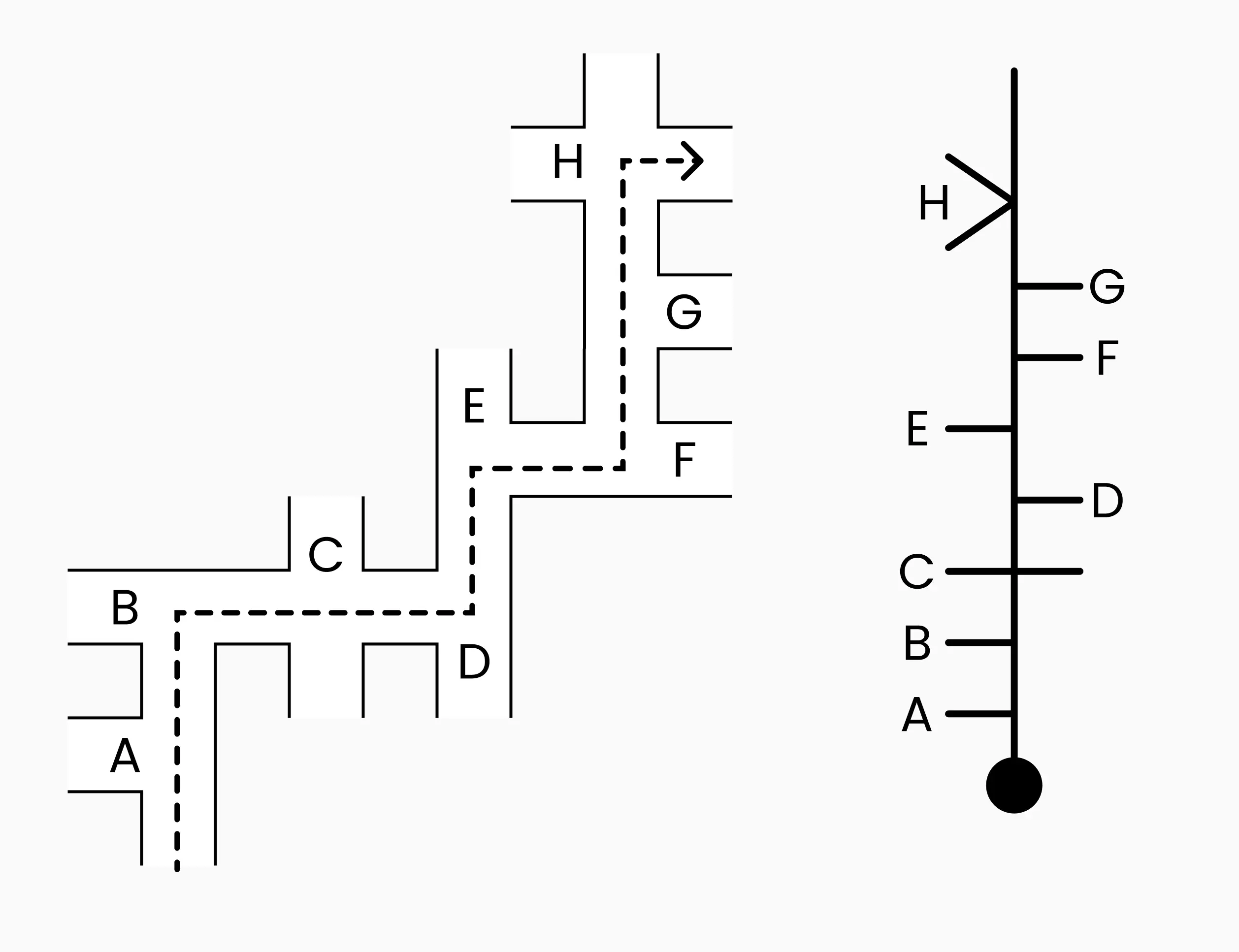Bij dit onderdeel is er een lijn weergegeven met vertakkingen links en rechts van de lijn. Deelnemers moeten de stripkaart van A naar B volgen. De vertakkingen geven de paden weer die niet ingeslagen moeten worden. De doorgaande lijn is dus ten opzichte van de aftakkingen het pad dat gekozen moet worden.