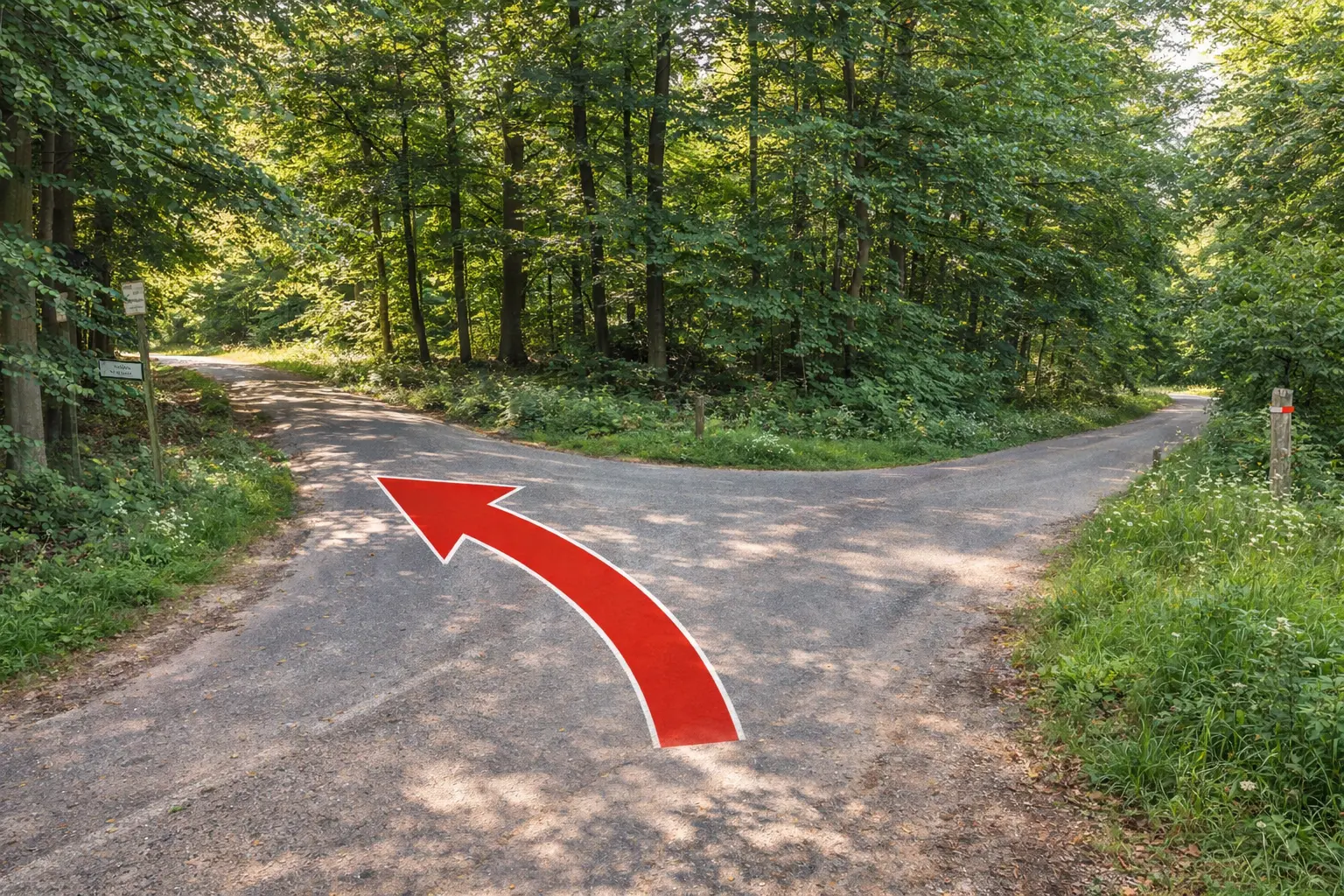 Voorbeeld: Staat bij een kruising van twee wegen (viersprong) een dubbele aftakking aan de linker kant van de lijn dan dient er rechtsaf geslagen te worden.
