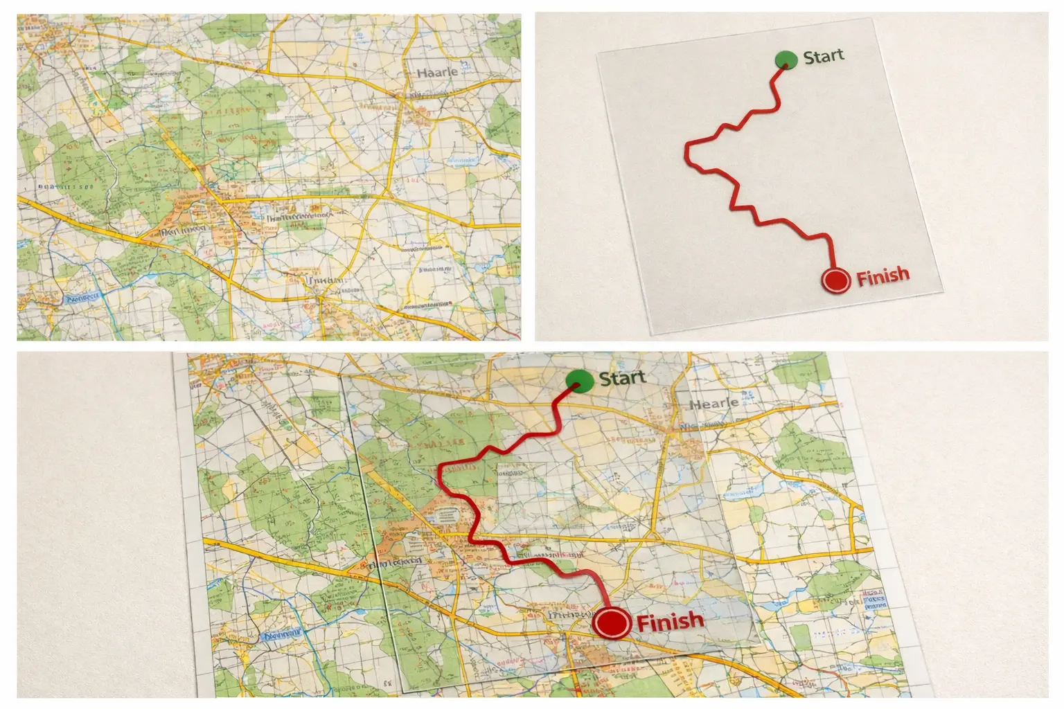 Deze routetechniek bestaat uit twee onderdelen. Een kaart waarop de wegen duidelijk zichtbaar zijn en een doorzichtige plastic vel met een duidelijk zichtbare routelijn erop weergegeven. De bedoeling is het plastic vel zo op de kaart te leggen dat de routelijn precies over de op de kaart aangegeven wegen valt. Hiermee is dan de route die gelopen moet worden op de kaart zichtbaar.