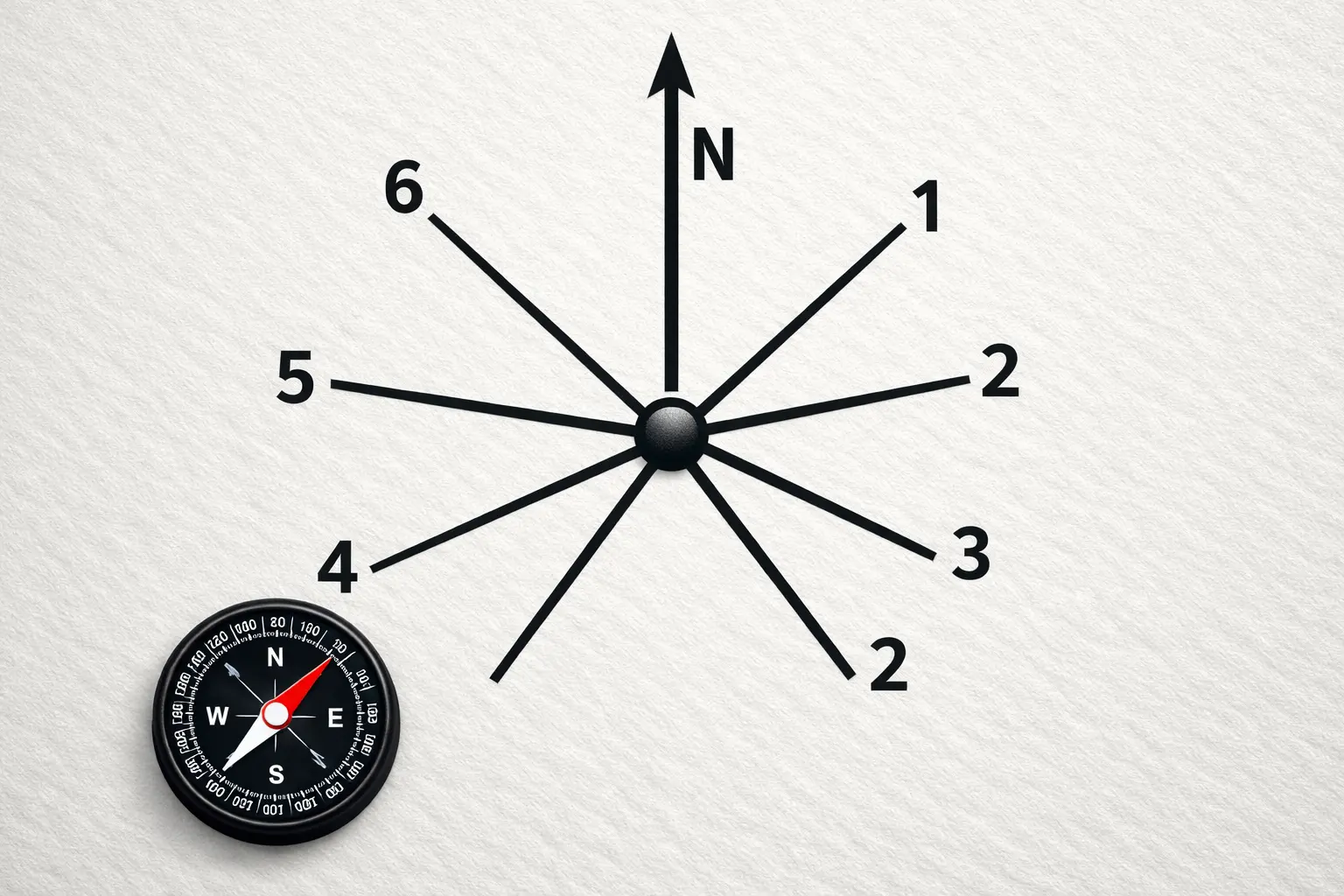 Bij deze route techniek is een ster van lijnen weergegeven die allemaal vertrekken vanuit het middenpunt. Een langere pijl met een ‘N’ erbij geeft aan waar het noorden is. De N-lijn kan met een kompas richting het noorden gericht worden. De overige lijnen zijn genummerd en geven van elk opvolgend kruispunt aan in welke richting de route vervolgt dient te worden.